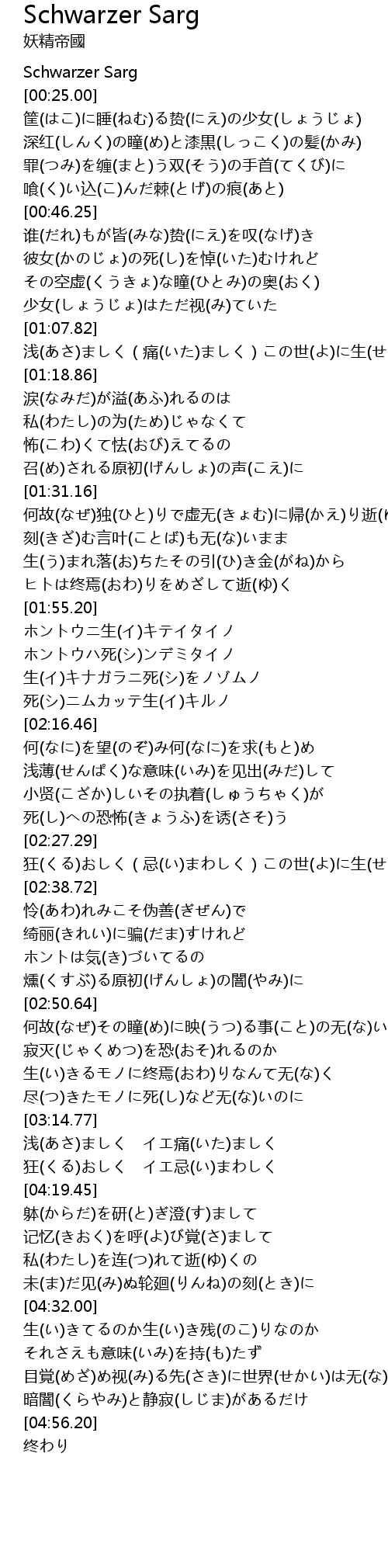 | [02:27.69] | 狂(くる)おしく(忌(い)まわしく)この世(よ)に生(せい)を受(う)けしモノ |