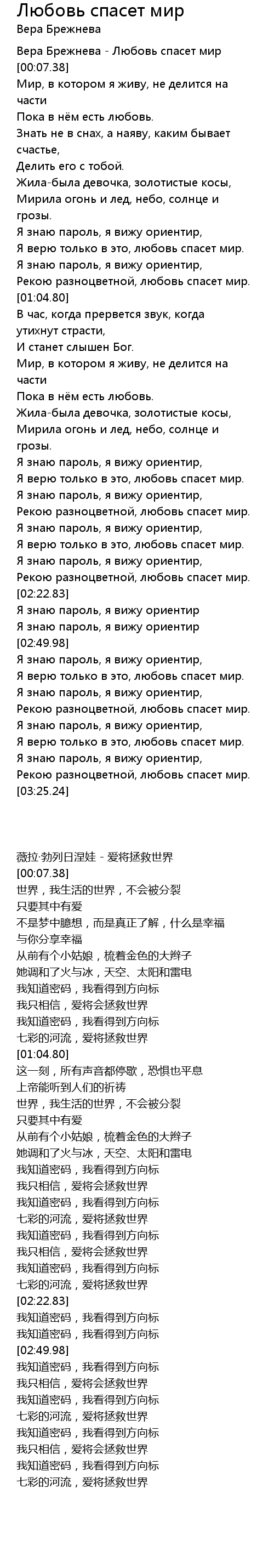 | [00:02.27] | 薇拉·勃列日涅娃 - 爱将拯救世界 |