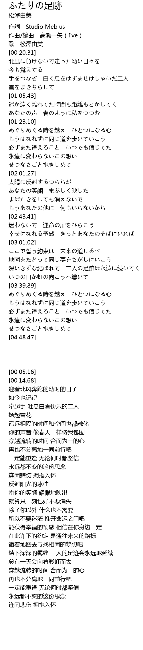 | [03:17.66] | 深いきずな結ばれて 二人の足跡は永遠に続いてく |