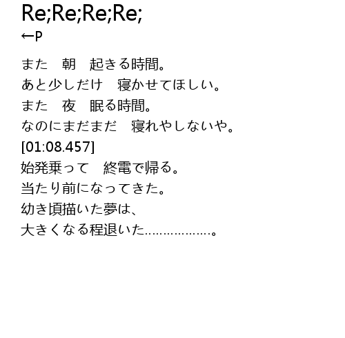 | [01:08.959] | 始発乗って 終電で帰る。 |