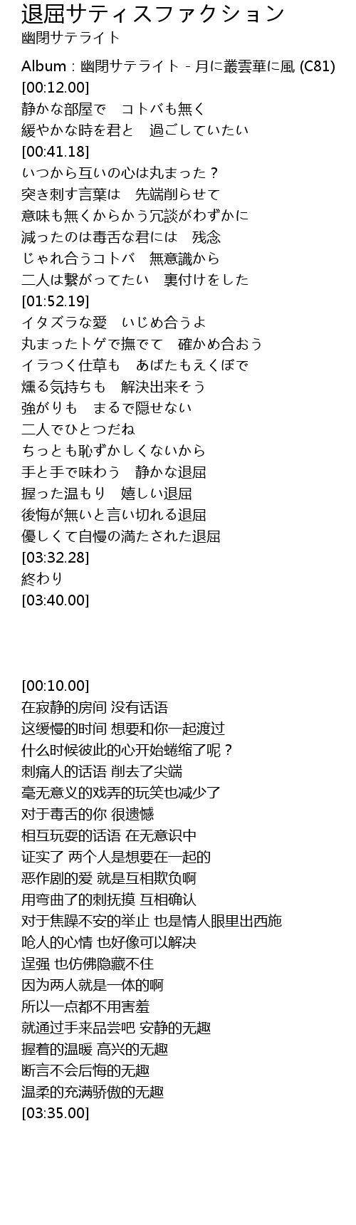 | [00:10.00] | Album:幽閉サテライト - 月に叢雲華に風 (C81) |