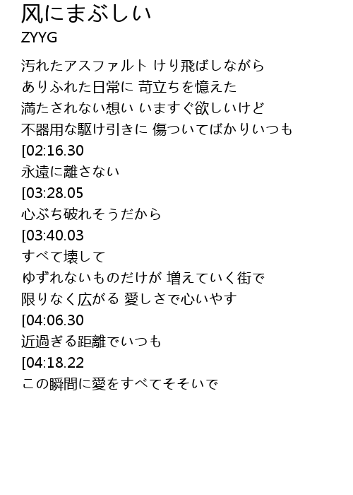 | [01:05.59][02:16.30][03:15.37][03:54.59] | 風にまぶしい 溶けていく君を 永遠に離さない |