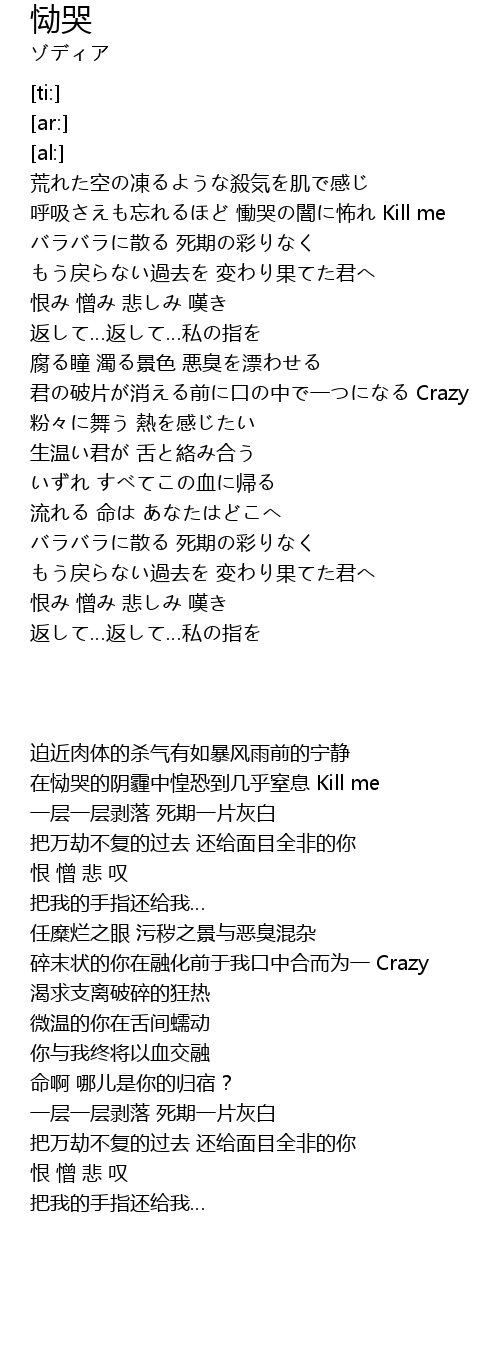 | [00:39.55] | 在恸哭的阴霾中惶恐到几乎窒息 Kill me |