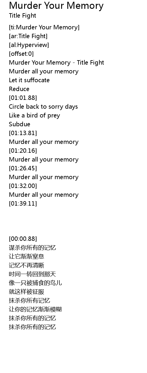 | [00:00.88] | Murder Your Memory - Title Fight |