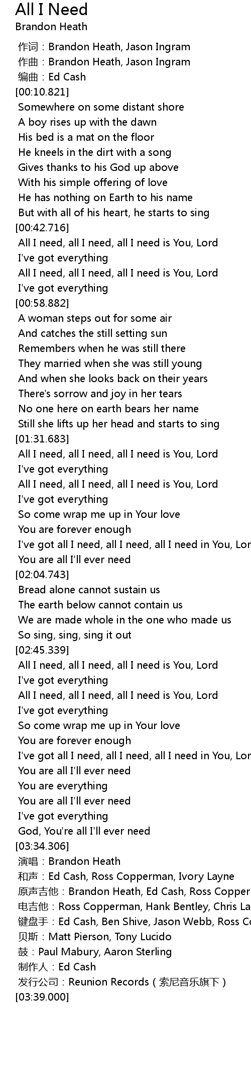 | [00:08.426] | 作词:Brandon Heath, Jason Ingram |