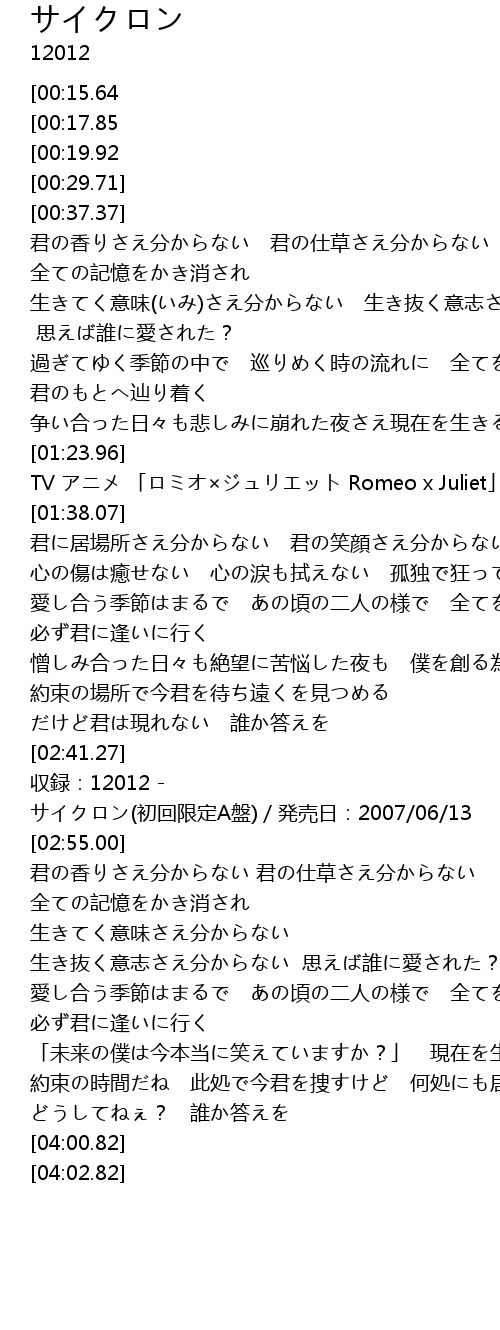 | [02:43.27] | 収録:12012 - サイクロン(初回限定A盤)/発売日:2007/06/13 |