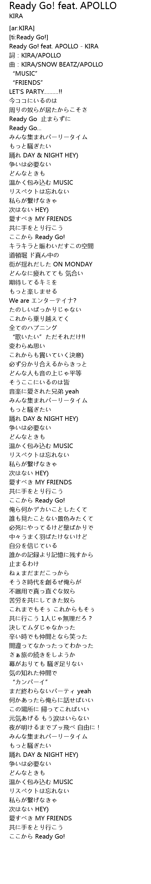 | [00:01.11] | Ready Go! feat. APOLLO - KIRA |