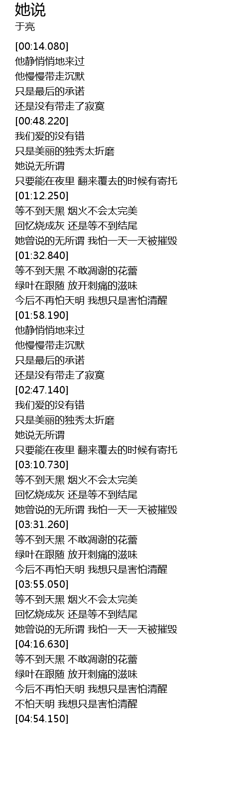 | [04:08.340] | 她曾说的无所谓 我怕一天一天被摧毁 |