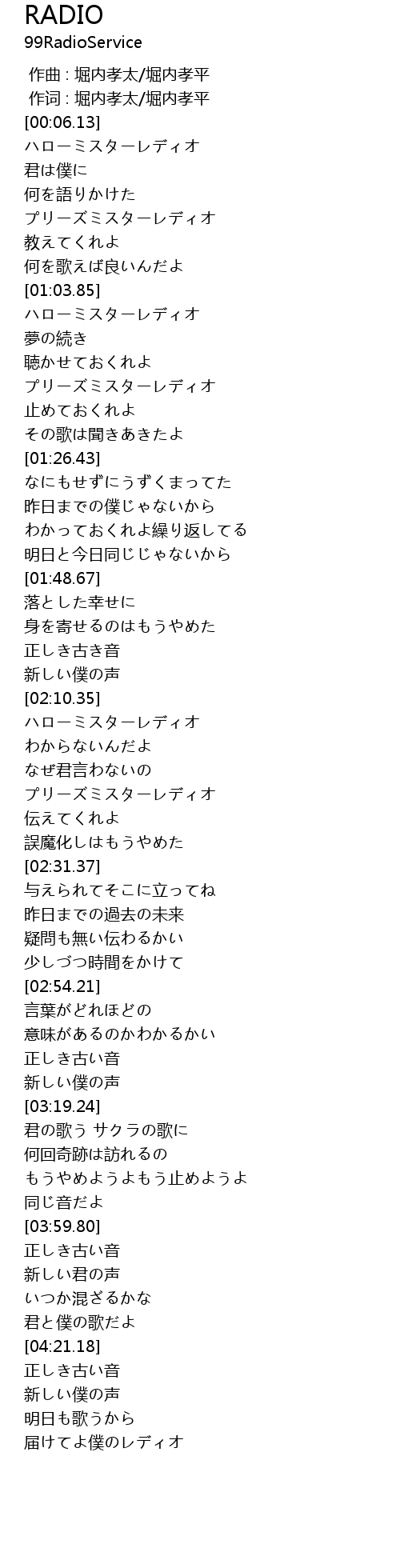 | [00:00.00] | 作曲 : 堀内孝太/堀内孝平 |