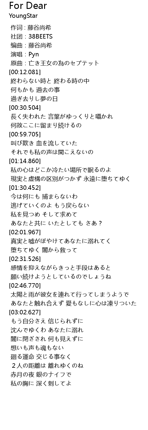 | [03:56.125] | 私の胸に 深く刺してよ |