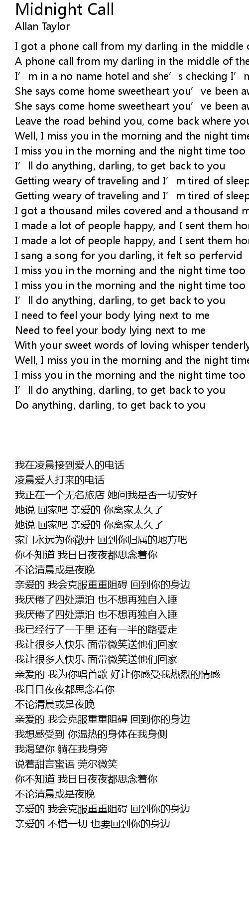 | [00:08.70] | I got a phone call from my darling in the middle of the night |