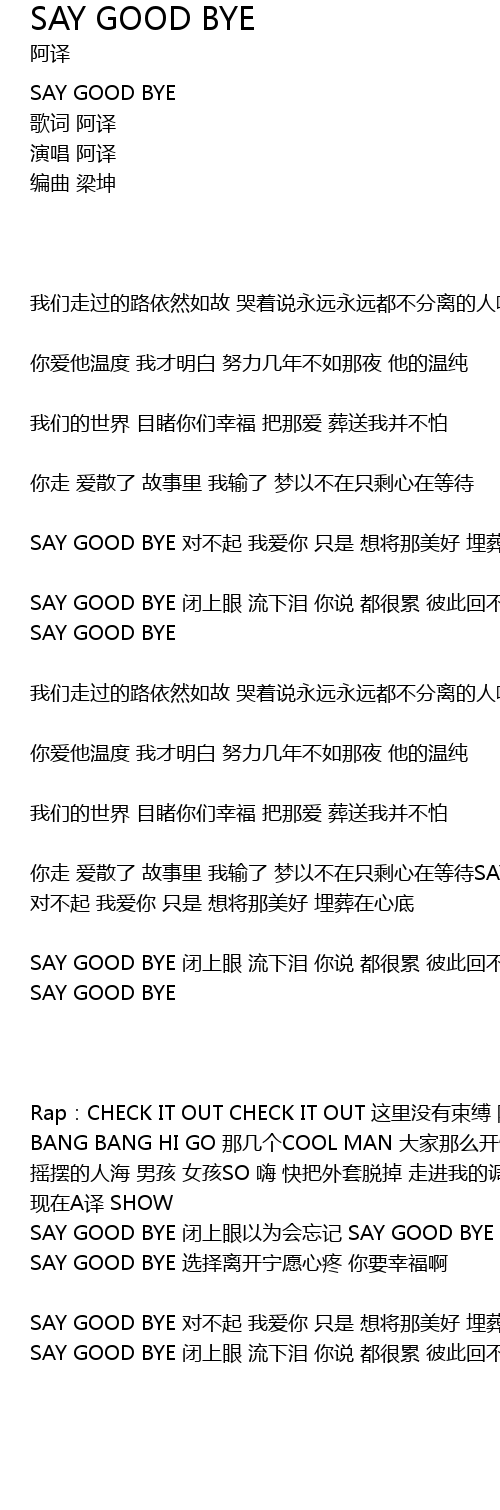 | SAY GOOD BYE bì shang yǎn yǐ wéi huì wàng jì SAY GOOD BYE yí lù zǒu lái nòng diū le nǐ | |
