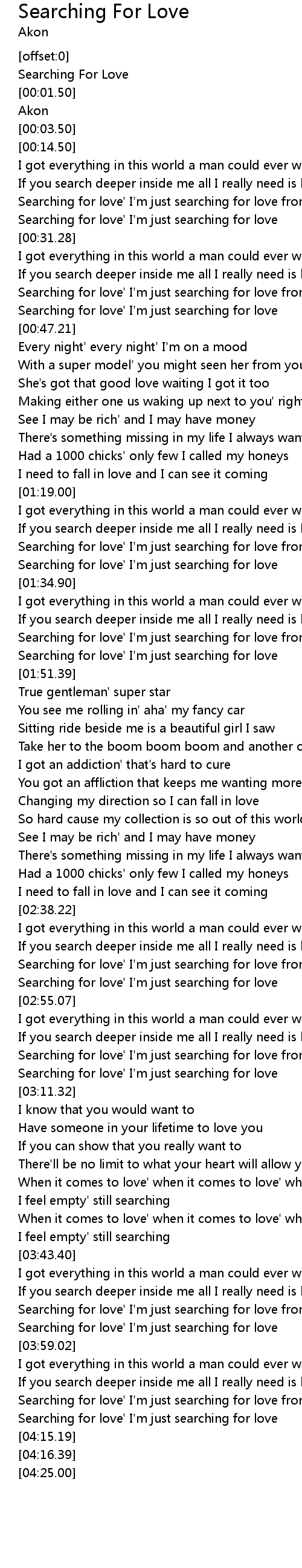 | [04:12.05] | Searching for love' I'm just searching for love |
