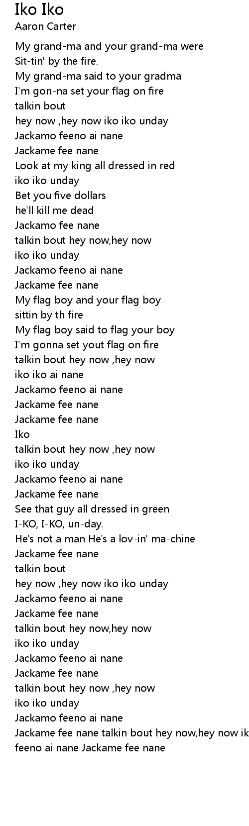 Jackame fee nane talkin bout hey now,hey now iko iko unday Jackamo feeno ai nane Jackame fee nane |