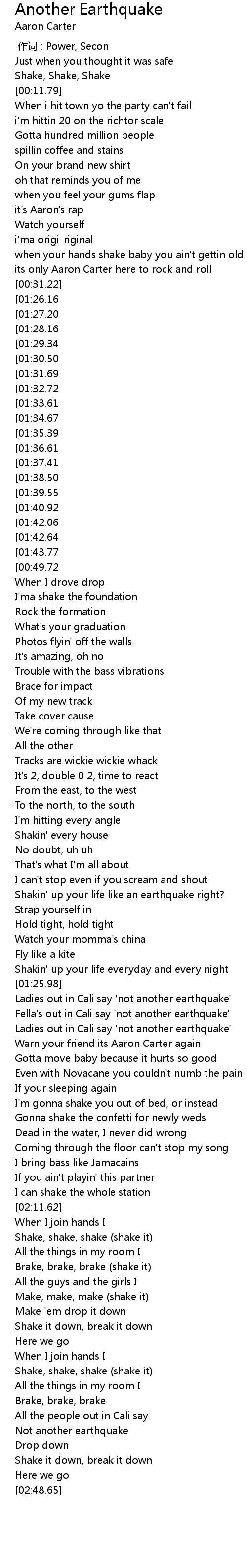| [02:26.45][01:40.92][00:46.27] | Not another earthquake |