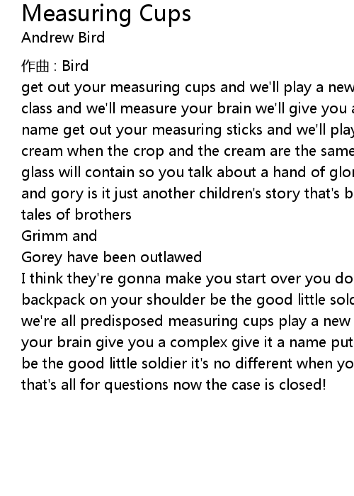 | get out your measuring cups and we' ll play a new game come to the front of the class and we' ll measure your brain we' ll give you a complex and we' ll give it a name get out your measuring sticks and we' ll play a new game can' t have the cream when the crop and the cream are the same liquid or gas no more than the glass will contain so you talk about a hand of glory a tale that' s rather grim and gory is it just another children' s story that' s been declawed? when the tales of brothers | |