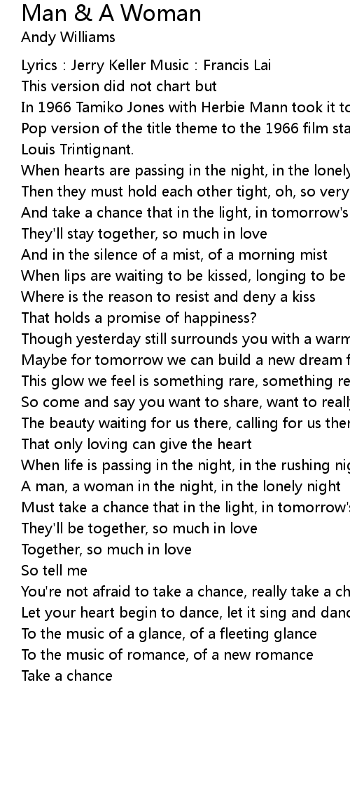 | Pop version of the title theme to the 1966 film starring Anouk Aimee and Jean- | |