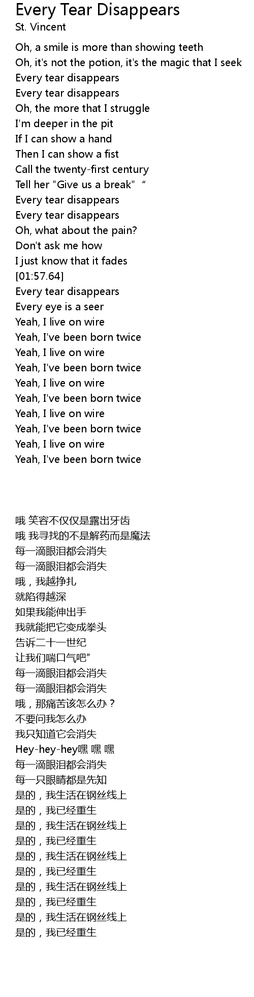 | [02:01.17] | Every tear disappears |