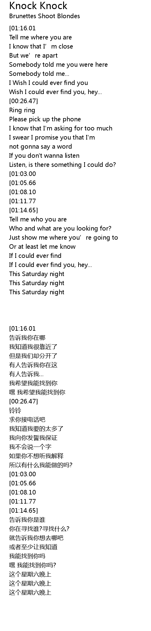 | [00:06.75][01:16.01] | Knock Knock |