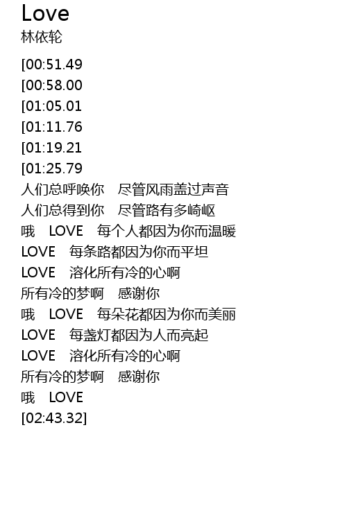 | [02:00.08] | LOVE 溶化所有冷的心啊 |