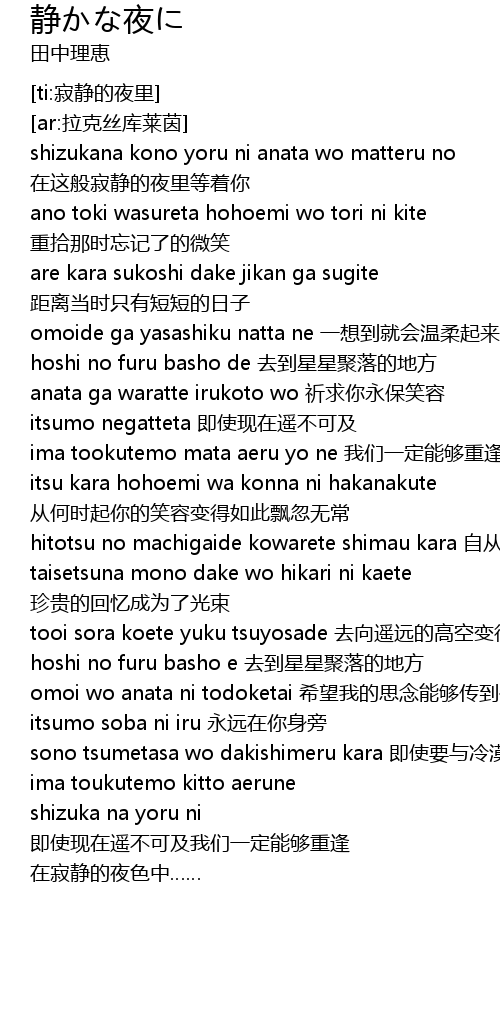 | [00:17.215] | shizukana kono yoru ni anata wo matteru no 在这般寂静的夜里等着你 |