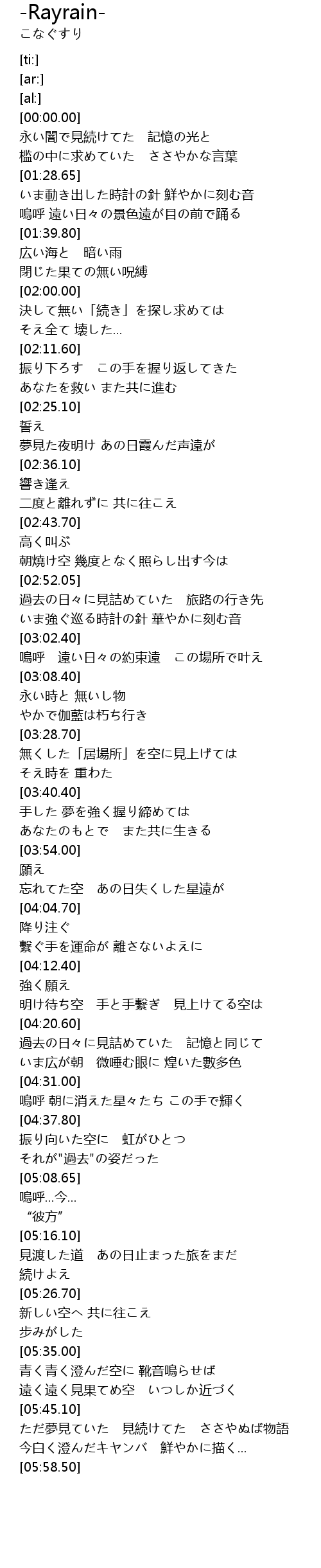 | [03:02.65] | 嗚呼 遠い日々の約束遠 この場所で叶え |