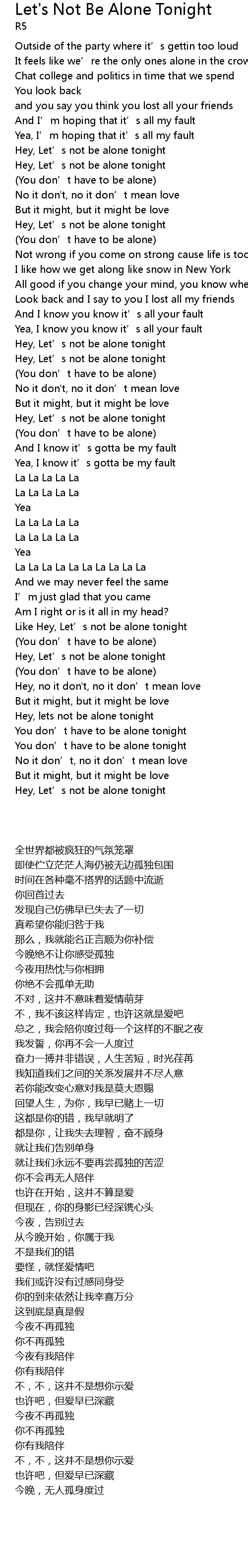 | [00:45.870] | Hey, Let' s not be alone tonight |