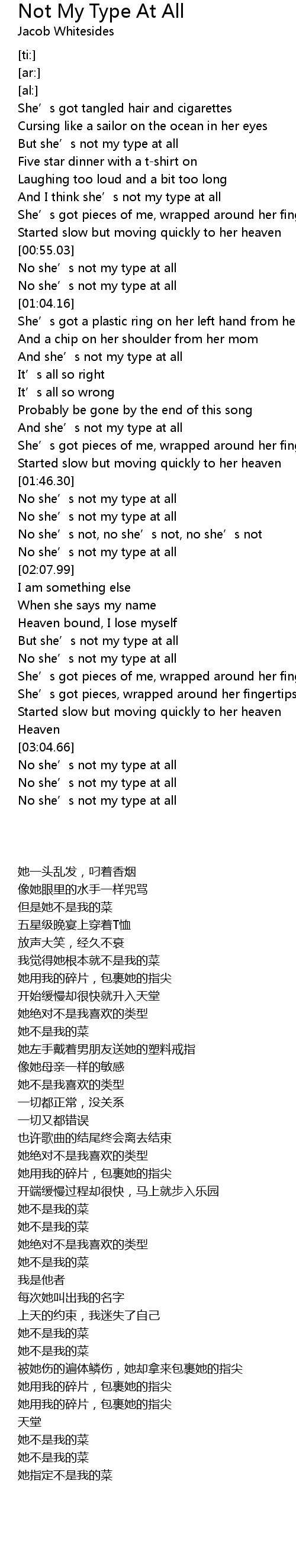 | [00:56.34] | No she’s not my type at all |