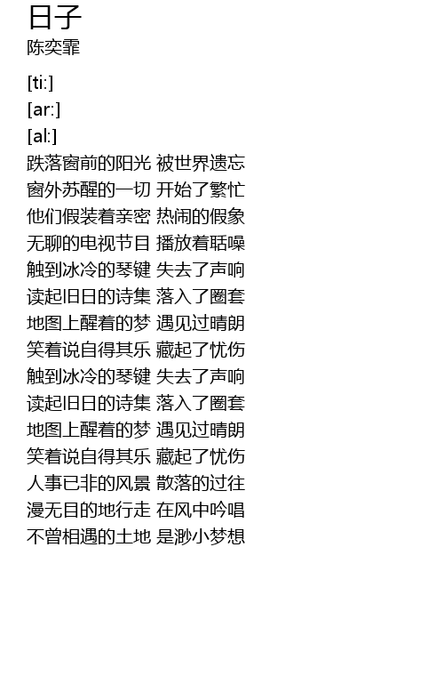 | [00:23.47] | 跌落窗前的阳光 被世界遗忘 |