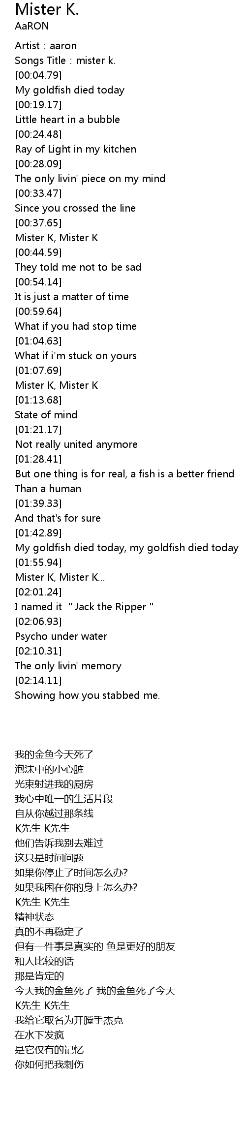 | [01:56.44] | Mister K, Mister K... |