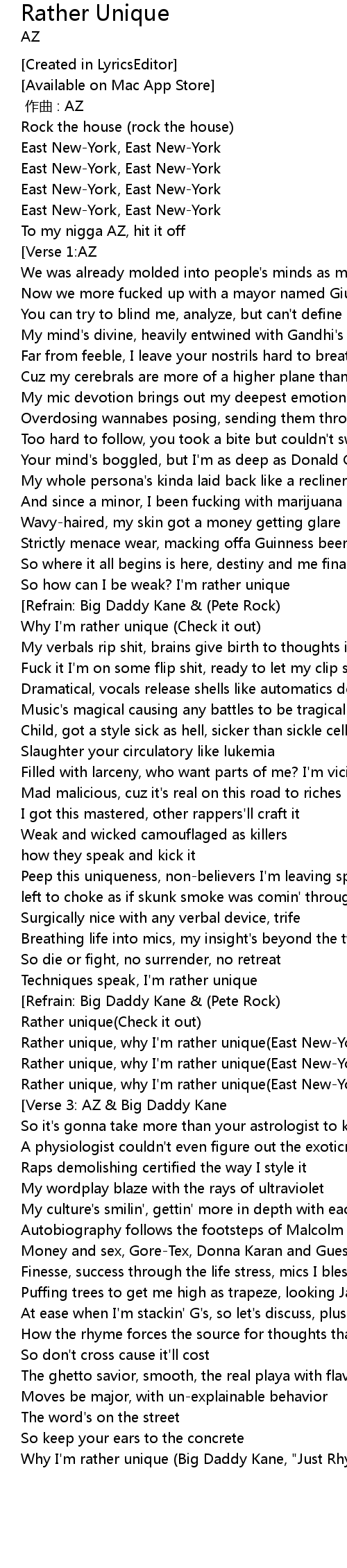 | [02:21.808] | Rather unique, why I' m rather unique East NewYork |