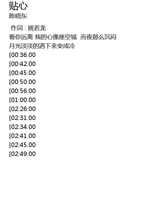 | [02:59.00][02:26.00][01:06.00] | 总是思念贴身就爱贴心 |