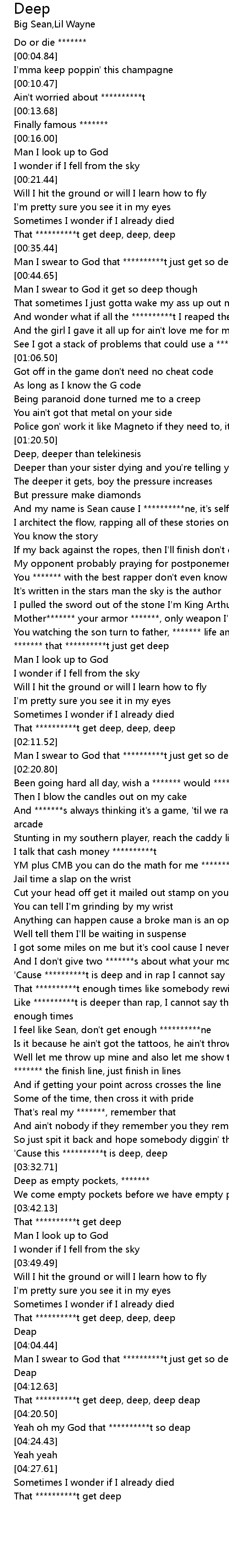 | [04:05.48] | Man I swear to God that **********t just get so deep, deep, deep, deep |