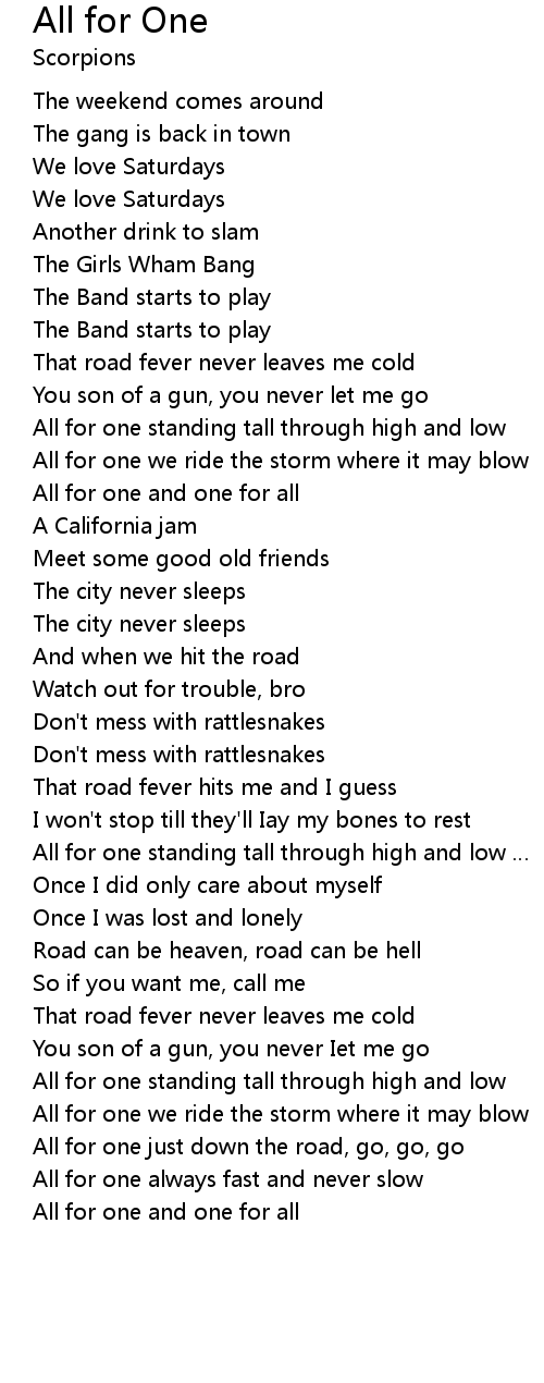 | All for one just down the road, go, go, go | |