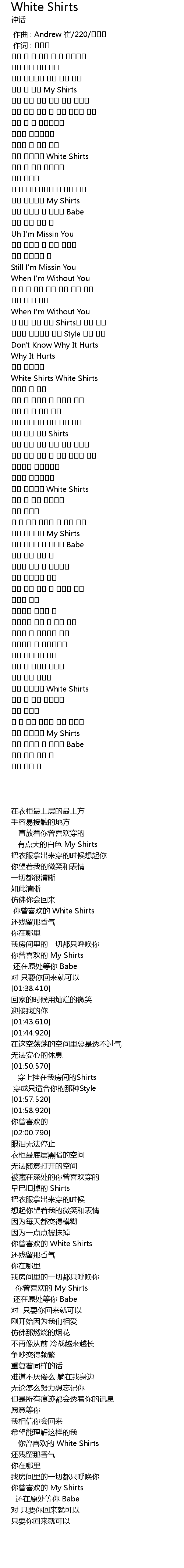 | [00:38.210] | 有点大的白色 My Shirts |