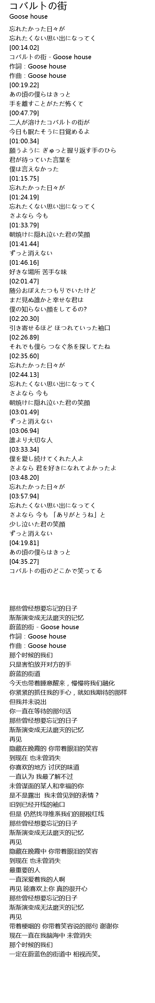 | [00:15.43] | 蔚蓝的街 - Goose house |