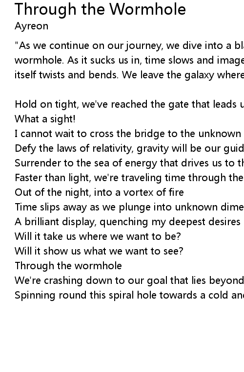 "As we continue on our journey, we dive into a black hole -- a spiraling wormhole. As it sucks us in, time slows and images become distorted. Reality itself twists and bends. We leave the galaxy where our journey began, headed for the unknown. Where will it take us?" [Fabio Lione, Lana Lane] |