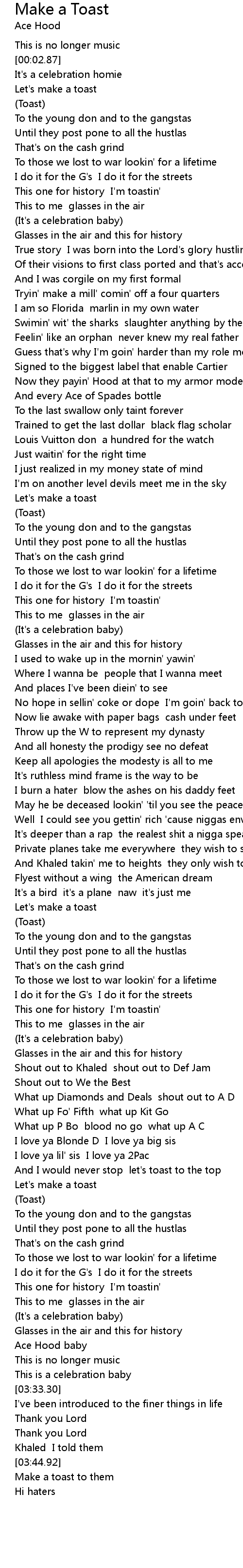 | [00:53.41] | Now they payin' Hood at that to my armor model |