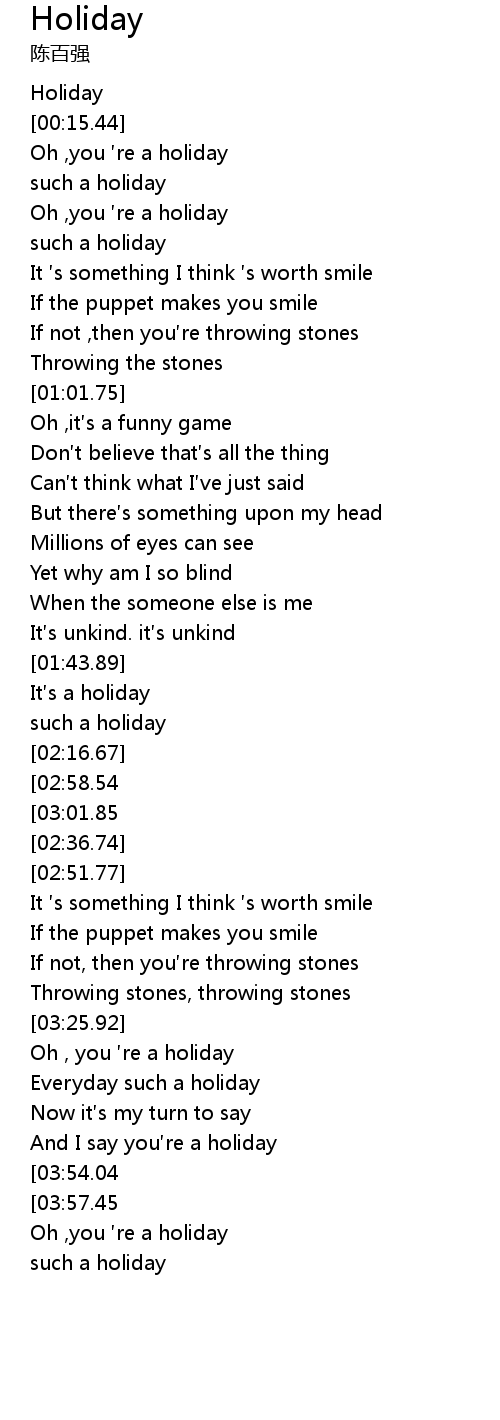 | [03:05.06][02:58.54][02:47.35][02:44.29][02:33.11][02:30.11] | you re a holiday |