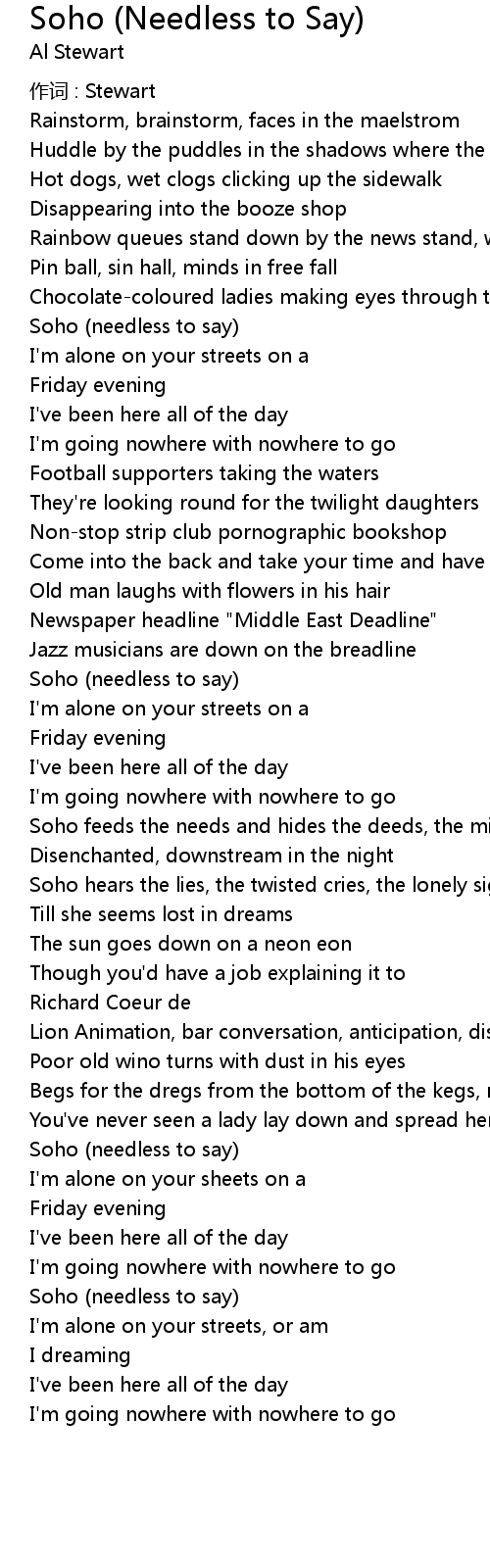 | Soho hears the lies, the twisted cries, the lonely sighs | |