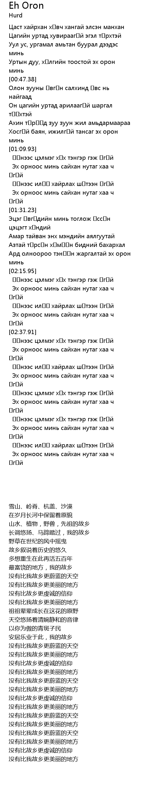 | [03:47.52] | Эх орноос минь сайхан нутаг хаа ч үгүй |
