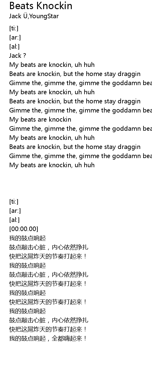 Gimme the, gimme the, gimme the goddamn beat. Beats are knockin |