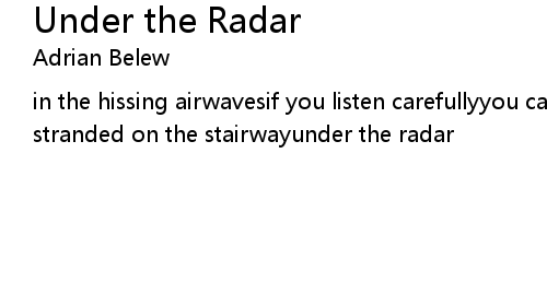 in the hissing airwavesif you listen carefullyyou can understand my fateto be stranded on the stairwayunder the radar