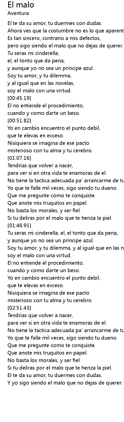 | [03:48.91] | Y yo sigo siendo el malo que no dejas de querer. |