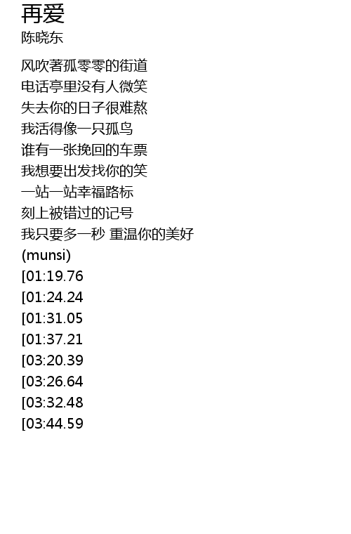 | [03:50.80][03:20.39][01:46.76] | 再爱一次再说一次给我你的消息 |