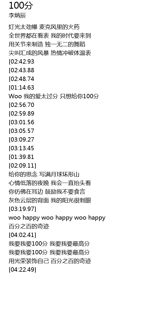 | [03:26.27][02:43.88][01:05.86] | Woo 心跳在狂奔 太高温 我要做到100分 |