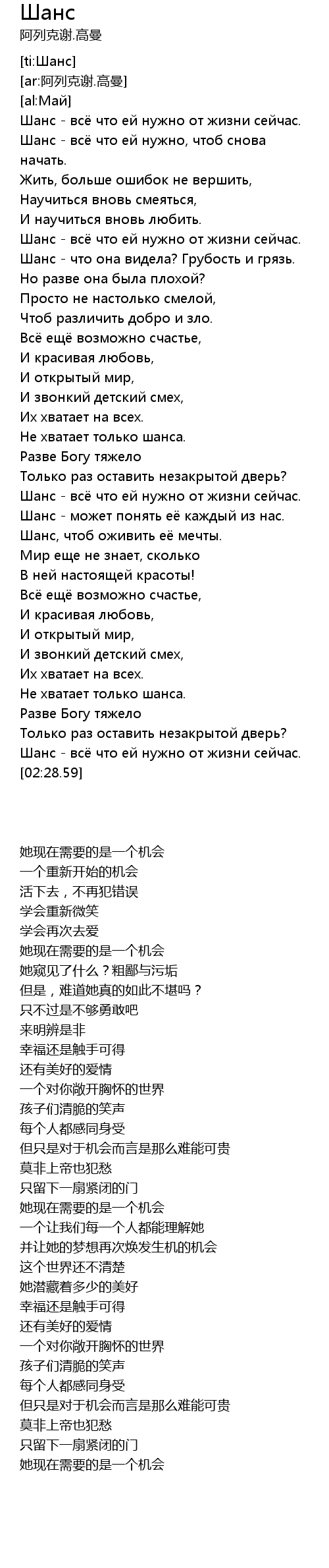 | [01:33.79] | Шанс - может понять её каждый из нас. |