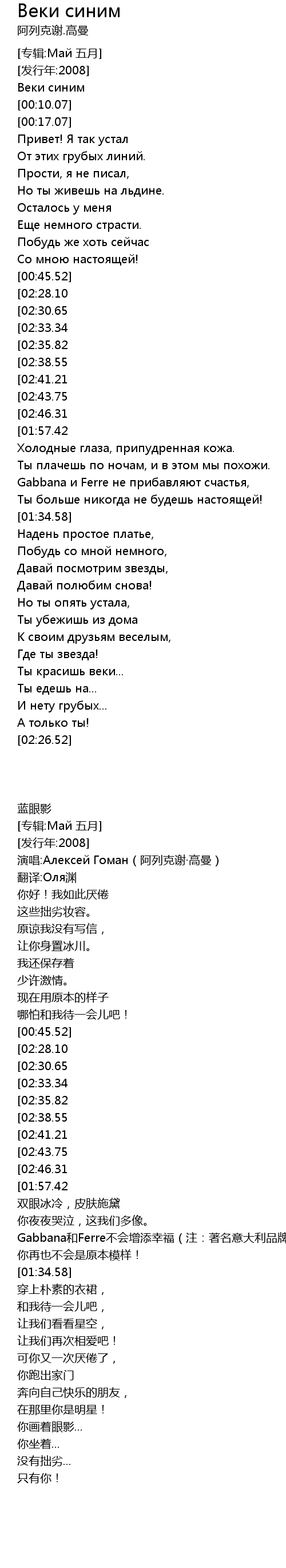 | [00:10.07] | 演唱:Алексей Гоман(阿列克谢·高曼) |