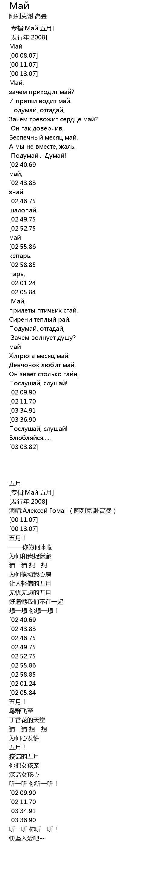 | [00:08.07] | 演唱:Алексей Гоман(阿列克谢·高曼) |