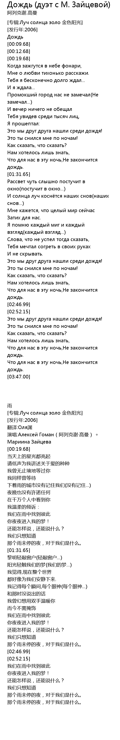 | [00:12.68] | 演唱:Алексей Гоман(阿列克谢·高曼) + Мариина Зайцева |